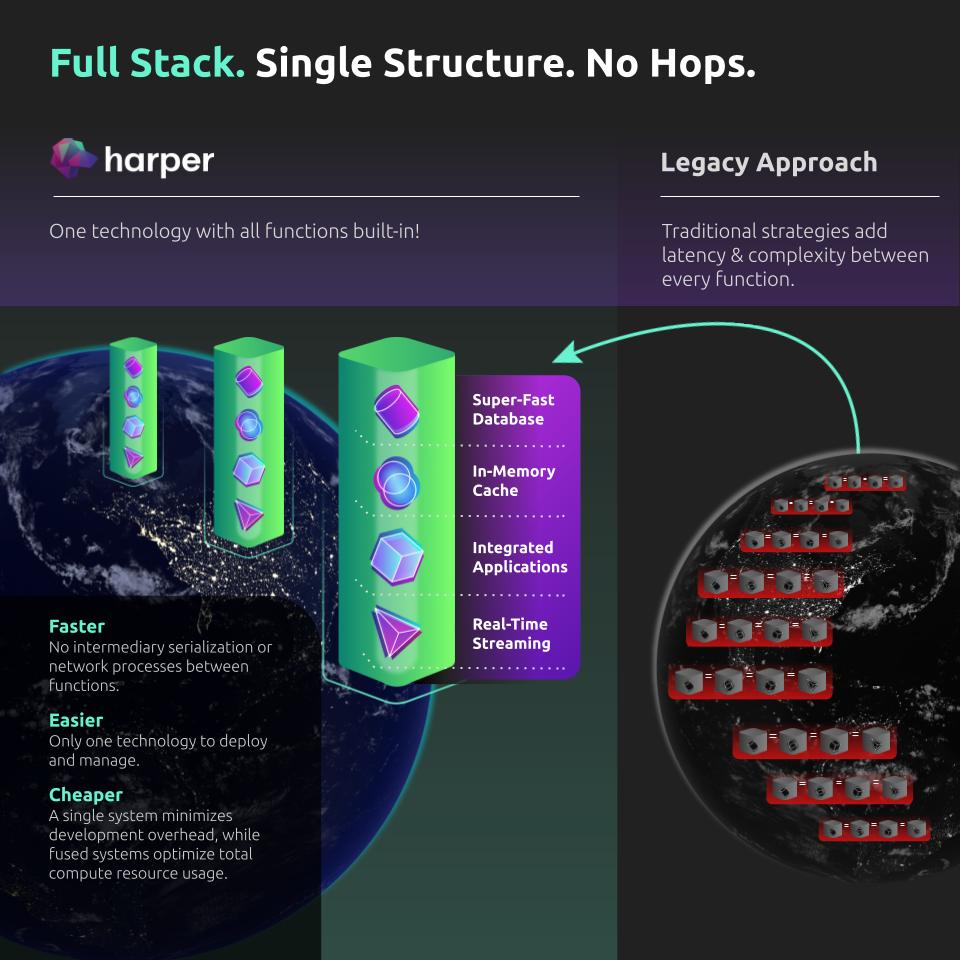 Harper is an all-in-one backend technology that fuses database technologies, caching, application hosting, and messaging functions into a single system. Unlike traditional architectures where each piece runs independently and incurs extra costs and latency from serialization and network operations between processes, Harper systems can handle workloads seamlessly and efficiently.