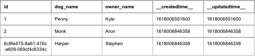 If we continue inserting records with the same data schema no schema updates are required. One record will omit the hash attribute from the insert to demonstrate GUID generation.