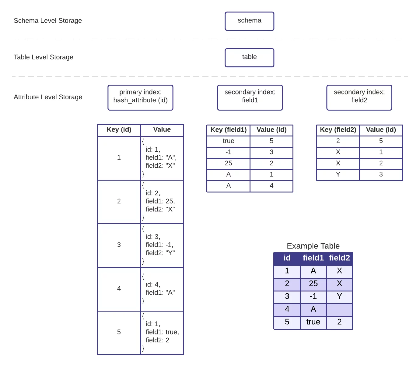 All top level attributes are automatically indexed immediately upon ingestion. The Harper Dynamic Schema reflexively creates both the attribute and index reflexively as new schema metadata comes in. Indexes are agnostic of datatype, honoring the following order: booleans, numbers ordered naturally, strings ordered lexically. Within the LMDB implementation, table records are grouped together into a single LMDB environment file, where each attribute index is a sub-database (dbi) inside said environment file. An example of the indexing scheme can be seen below.